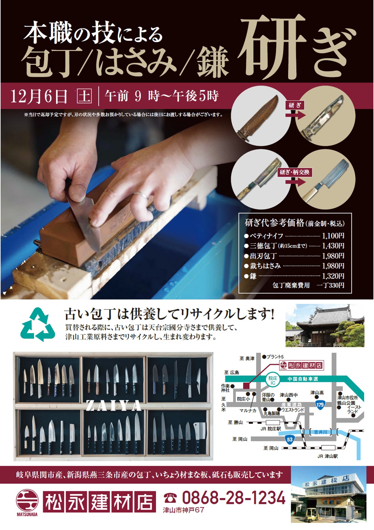 来週末12月6日(土)、当社にて「刃物研ぎイベント」開催します。