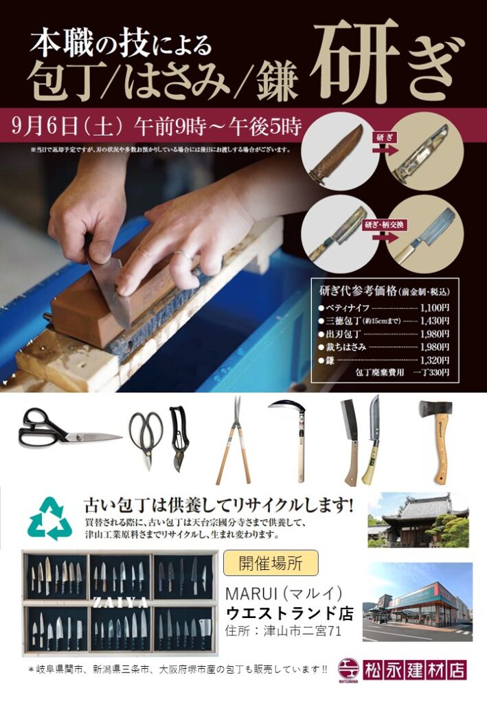 今週末9月6日(土)、マルイウエストランド店さん「刃物研ぎ」イベント開催します。